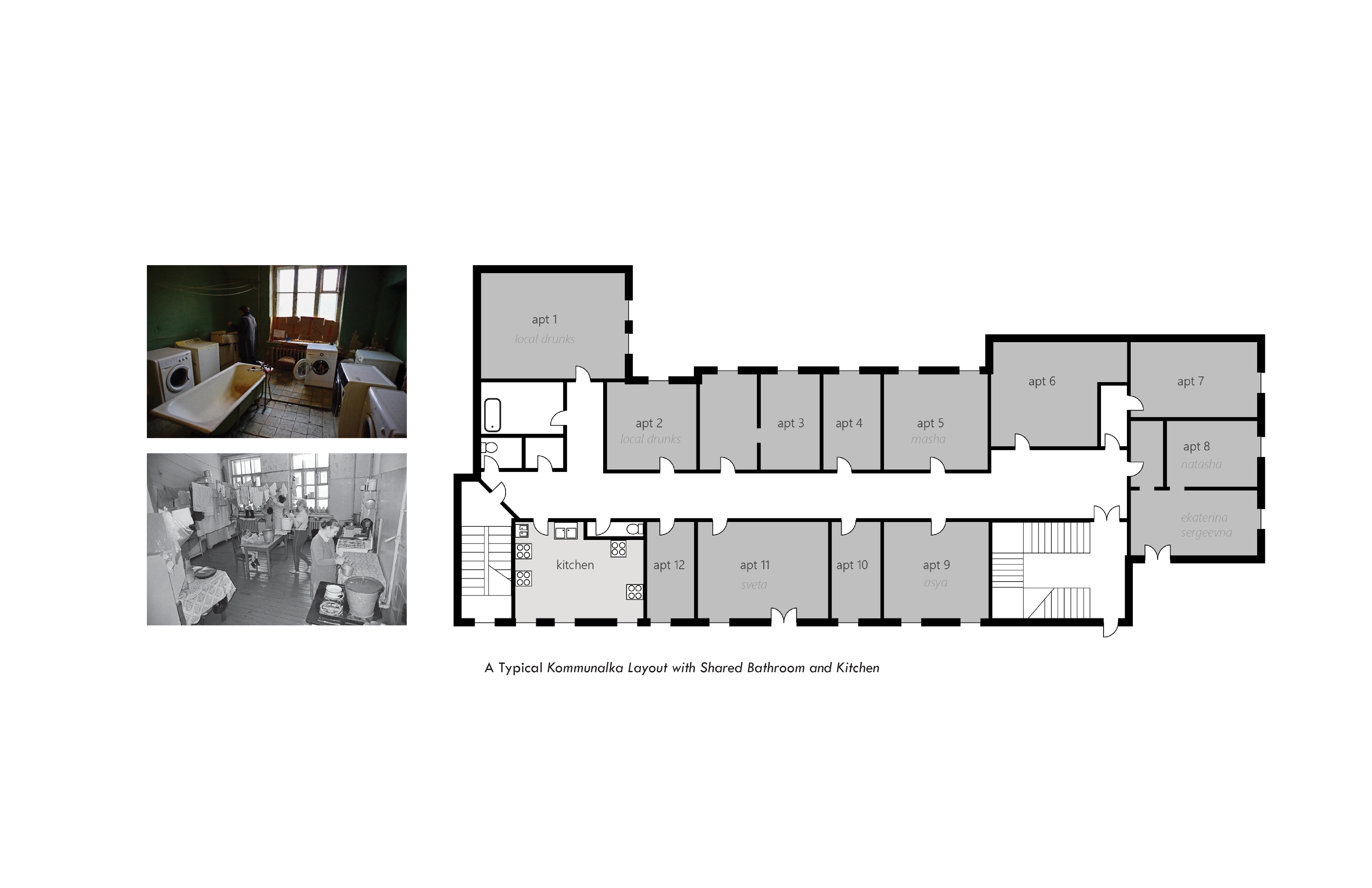 “Kommunalka – a term of endearment and deprecation – was a result of the post-revolutionary expropriation and resettlement of private apartments in the urban centers; it consists of the individual or family rooms (neither living rooms, bedrooms, nor studies, but all-purpose rooms that can perform any function) and ‘places of communal use’, a euphemistic expression for a shared bathroom, corridor and kitchen that usually serves as the neighbors’ battleground. Here one encounters endless schedules of ‘communal duties’, and endless scolding from fellow neighbors.”