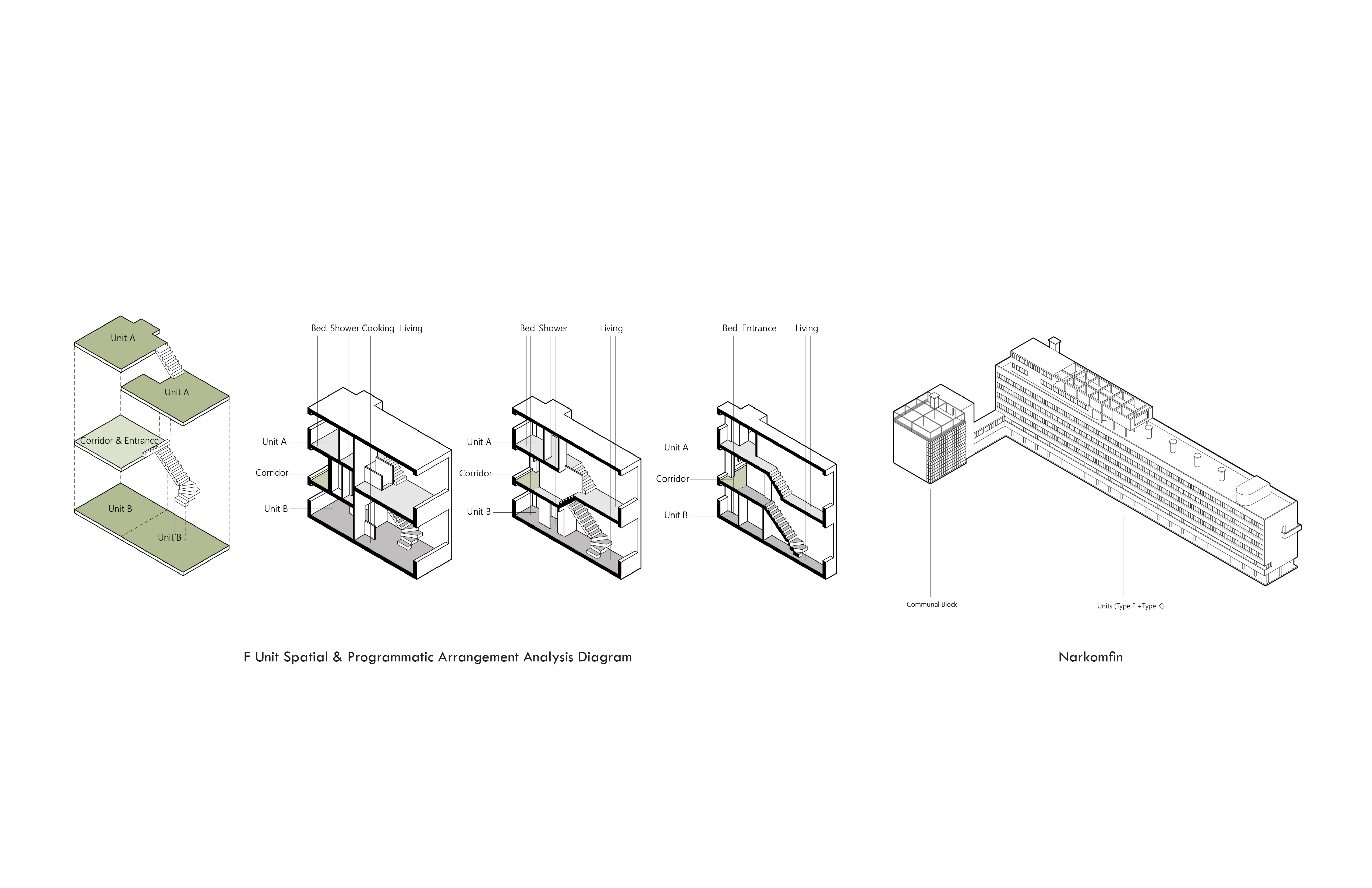 Designed by Moisei Ginzburg and Ignaty Milinis in 1928, Narkomfin is a transitional project in a series of social housing experiments initiated by the OSA Group (Organization of Contemporary Architects). Among the unit types developed in Narkomfin, F Unit was particularly significant, as it successfully represented the social concepts formulated by OSA and Ginzburg in the specific historic moment.