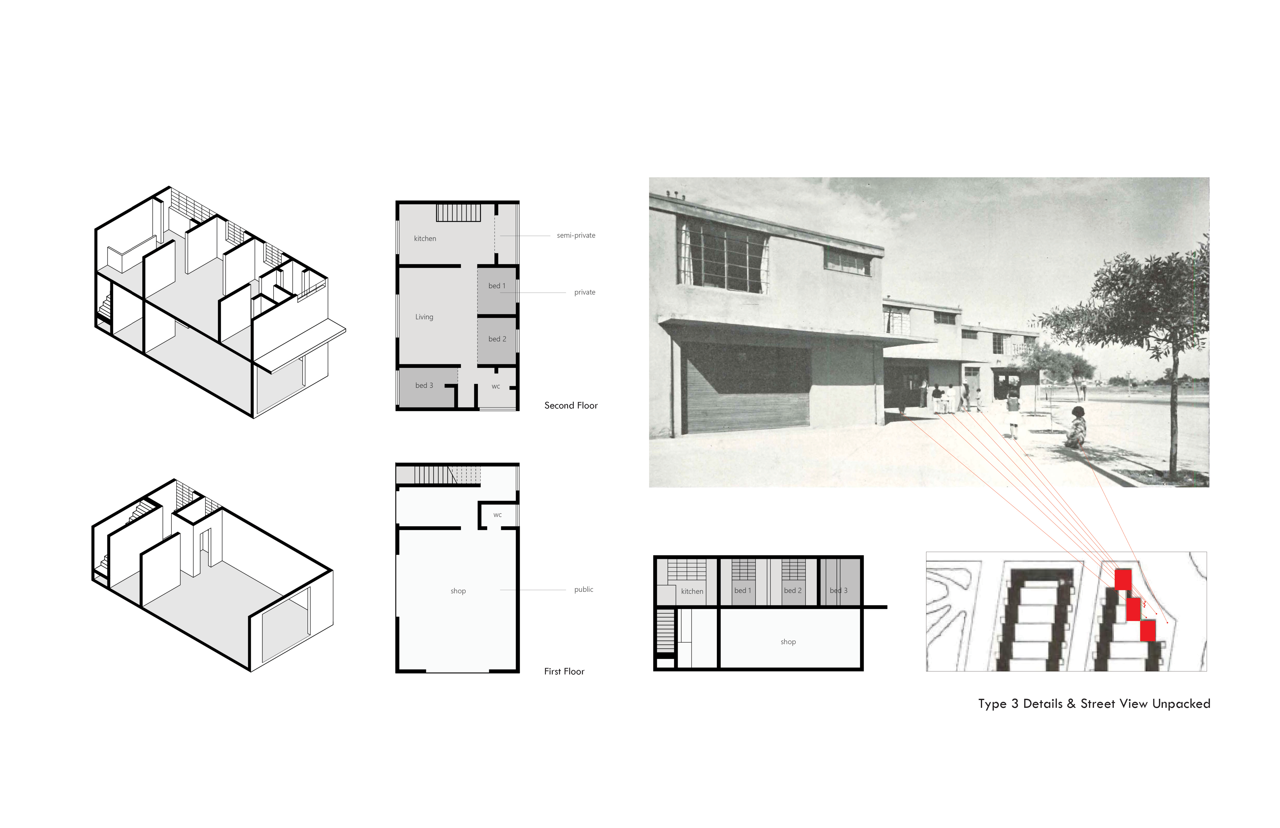 Unit Type 3 is an outstanding example of how Legarreta’s progressive social ideas are realized through reinvention of the social housing typology. Instead of making the ground level into living quarters, Legarreta transforms it into a commercial space. The “shop” allows the working-class family to gain additional income through small businesses. At the same time, the family shops formed a social space. People from the neighborhood could gather outside the storefronts, bringing conversations into the streets. Through this simple gesture, Legarreta designed a worker’s house that leaves room for the formation of community and blurs the boundary between domestic space, social space and commercial space. While Legarreta shortens the distance between these programs, he does not limit family privacy; upstairs, the living room, kitchen and bedroom can be accessed through a side entrance, which is undisturbed and uninterrupted by the “shop” space.