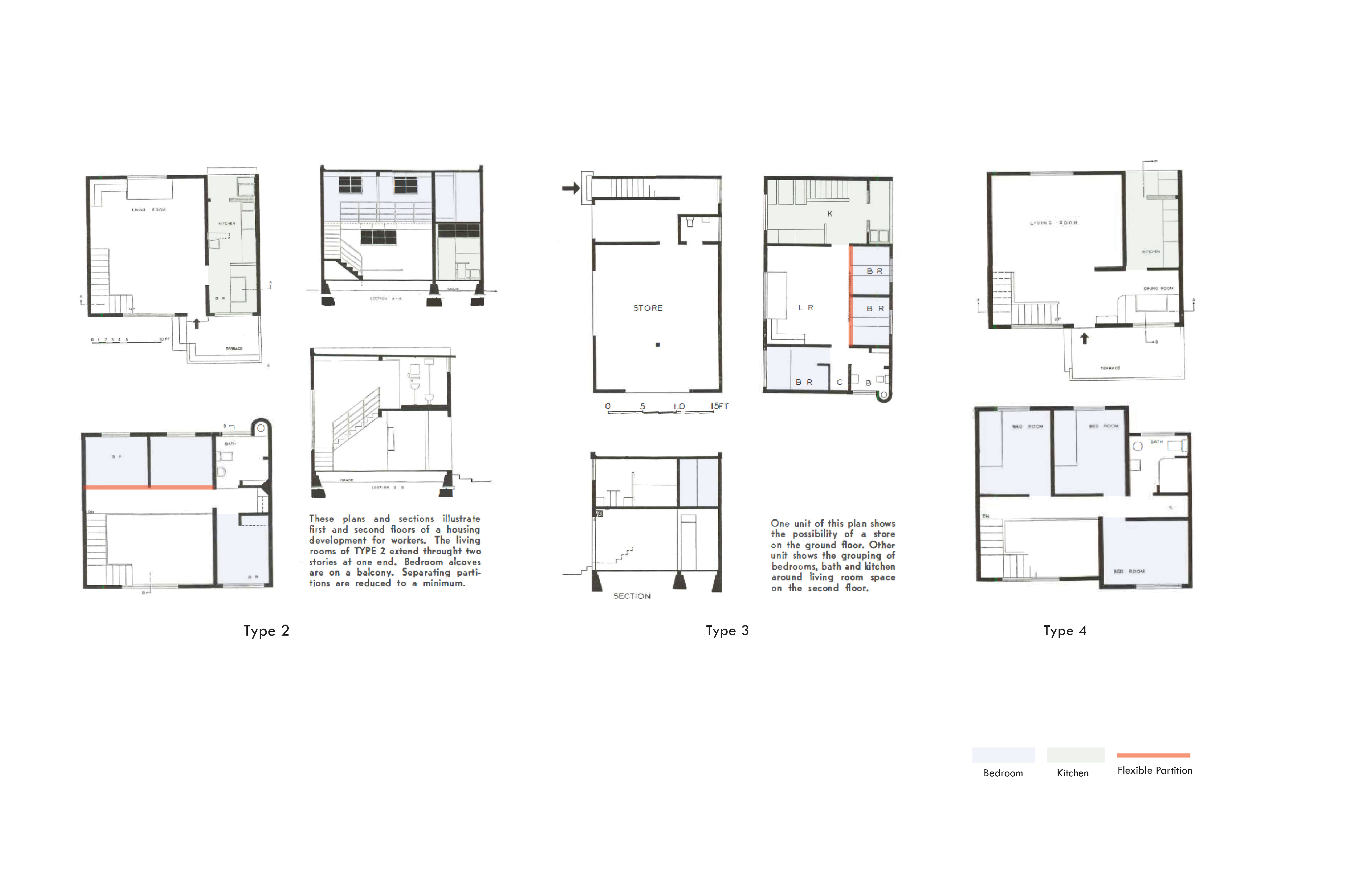 Much like Type 3, Type 2 Unit is a duplex house. For this unit type, Legarreta designed a spacious double-height living room, which is illuminated by a large, industrial scale window that is uninterrupted between the two levels. This architectural gesture shows a clear influence by Le Corbusier. In Maison Ternisien, for example, Corbusier designed a double-height living room/workshop, which is connected to an open corridor on the second level and a bedroom with a flexible partition. A compressed single-level kitchen and dining area is located on the side, spatially differentiated from the living room/workshop. All of these features can be found in Legarreta’s Type 2. However, while Le Corbusier had designed a mansion for a bourgeois artist-musician couple, Legarreta wanted to give the same kind of double-height space, open plan, modern kitchen and bathroom, and flexible partition system to Mexican workers and artisans.