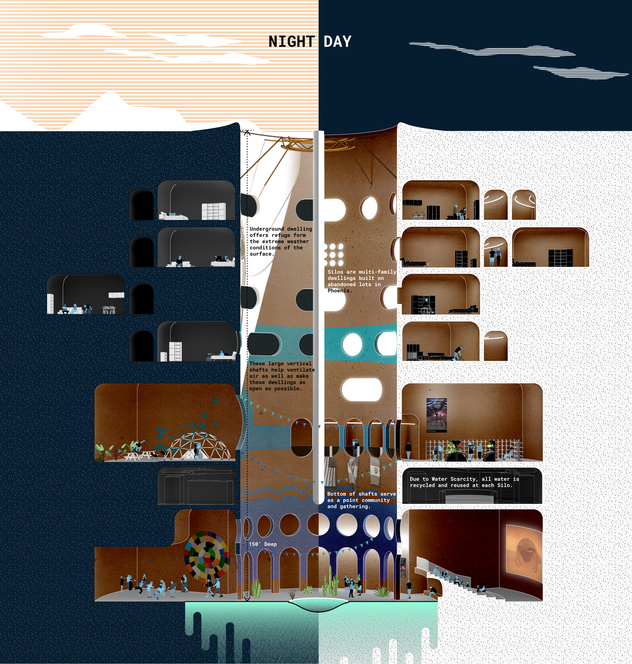 PHOENIX2100 is narrated through the story of a Guatemalan family seeking asylum in the United States in the year 2055, The Torres family. The project narrative takes us through the two-year period in which the family migrates, settles, and begins to work in the transformed Phoenix, Arizona of the future. In 2055, extreme temperatures and dust storms have made the surface unlivable, pushing new dwellings underground and changing the day and night cycles to mitigate the uninhabitable conditions of the surface. Moreover, contemporary single-family homes are designed to meet the challenges of underground life. Work and play are powered by energy production on the surface.