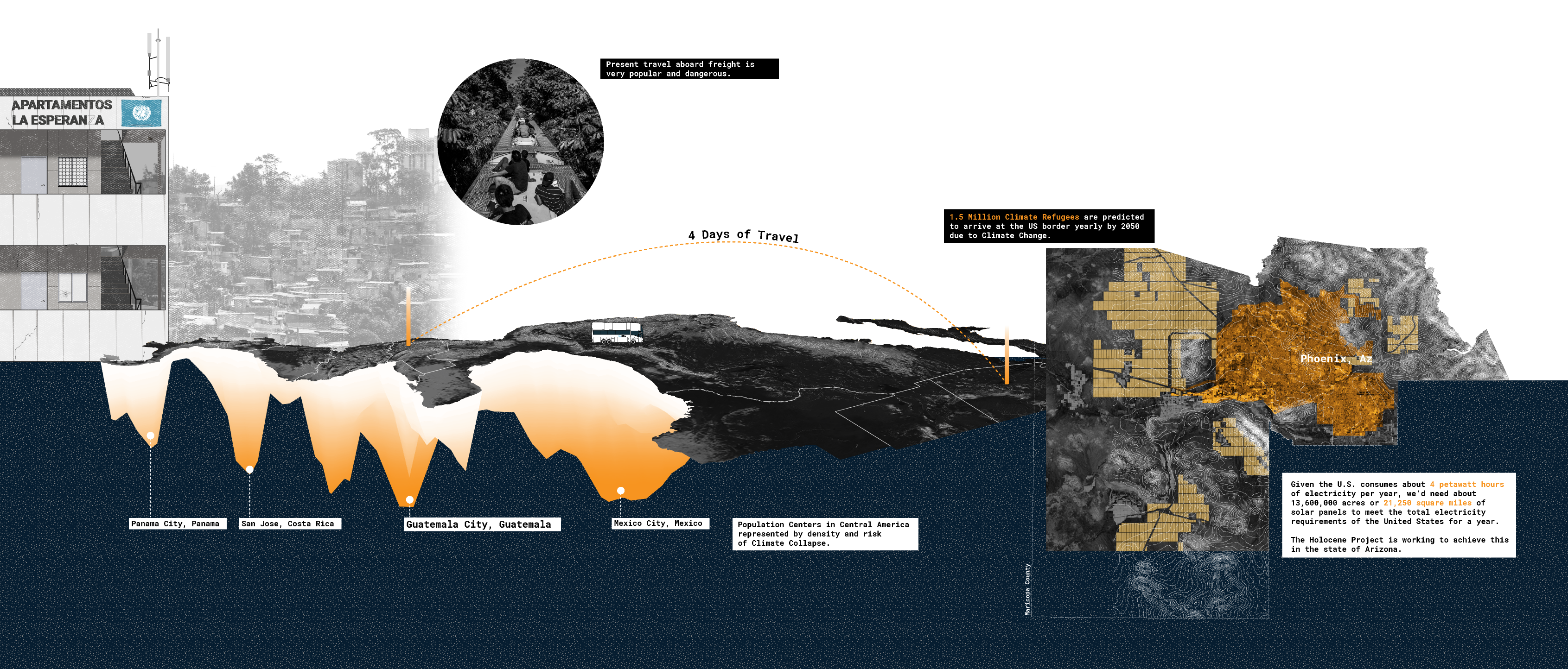 PHOENIX2100 imagines the transformation of Phoenix for a 22nd-century apocalyptic climate. The project is premised on a vision of America that opens its borders and accepts all climate refugees, dismantling its present condition as a “fortress” nation. Furthermore, it proposes a policy framework that accelerates current efforts by The Holocene Project to understand climate variability and generate rapid adaptation strategies in vulnerable U.S. cities. Moreover, it envisions a Climate Citizen Corps, a cooperative labor force that utilizes the framework of the Green New Deal to accomplish its climate infrastructure goals.