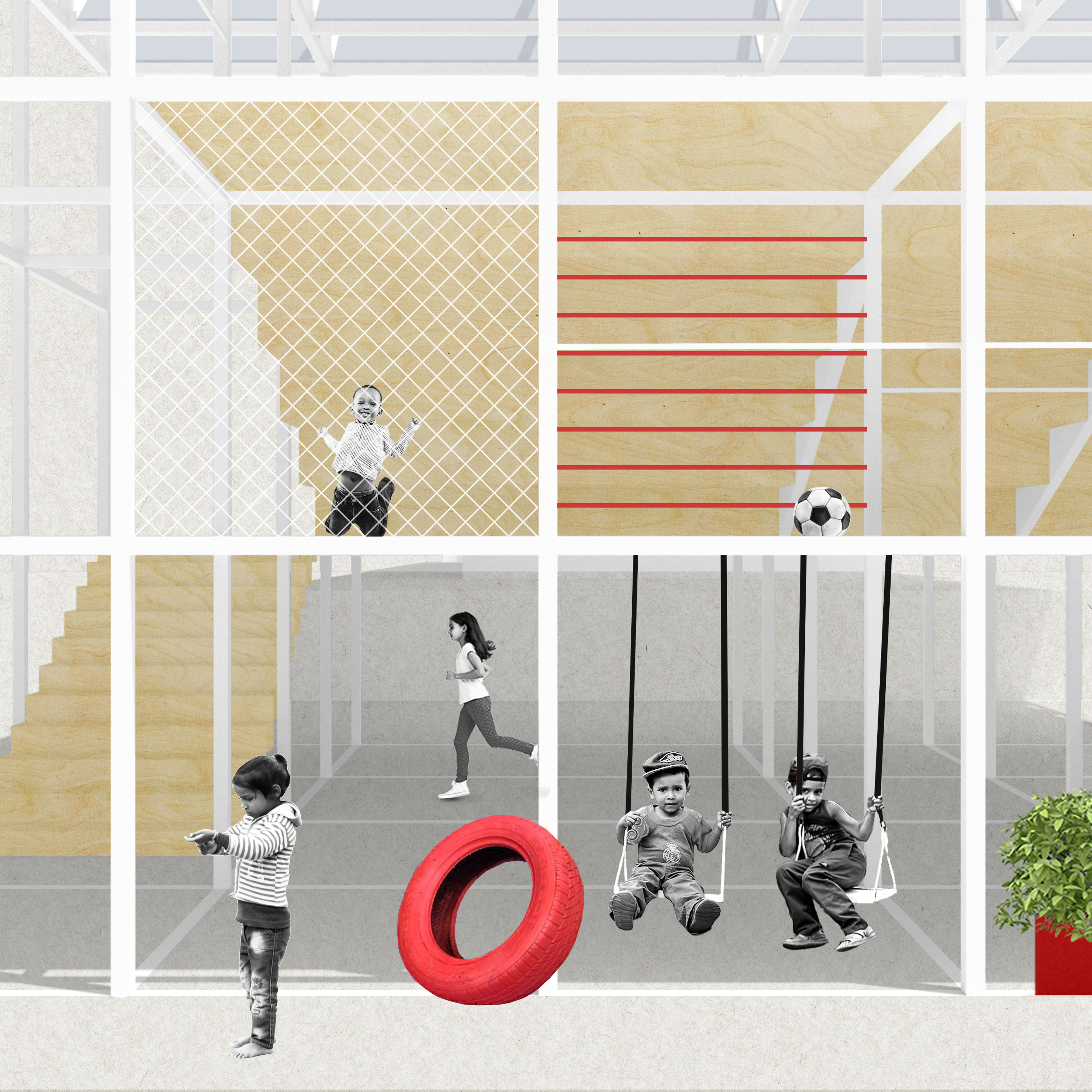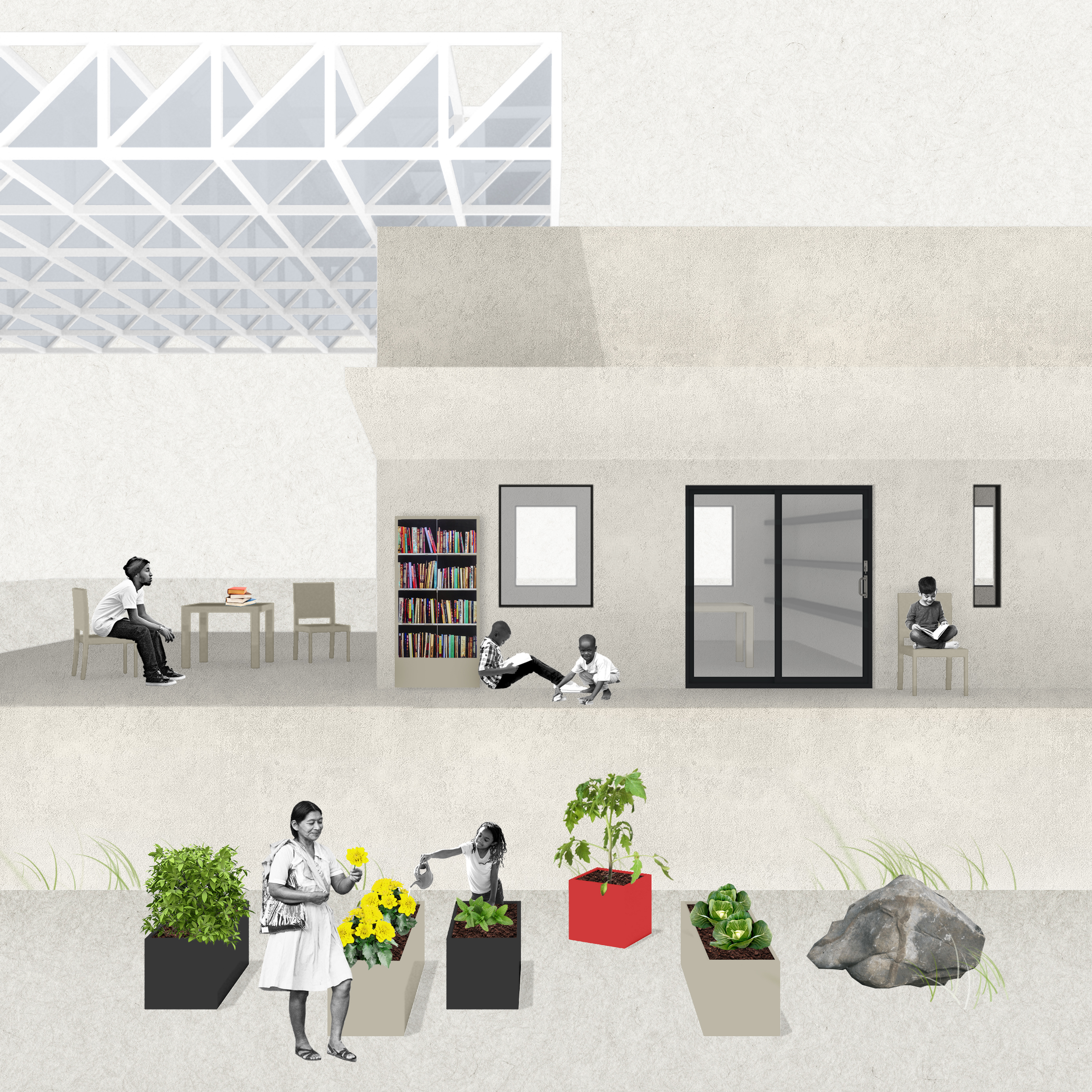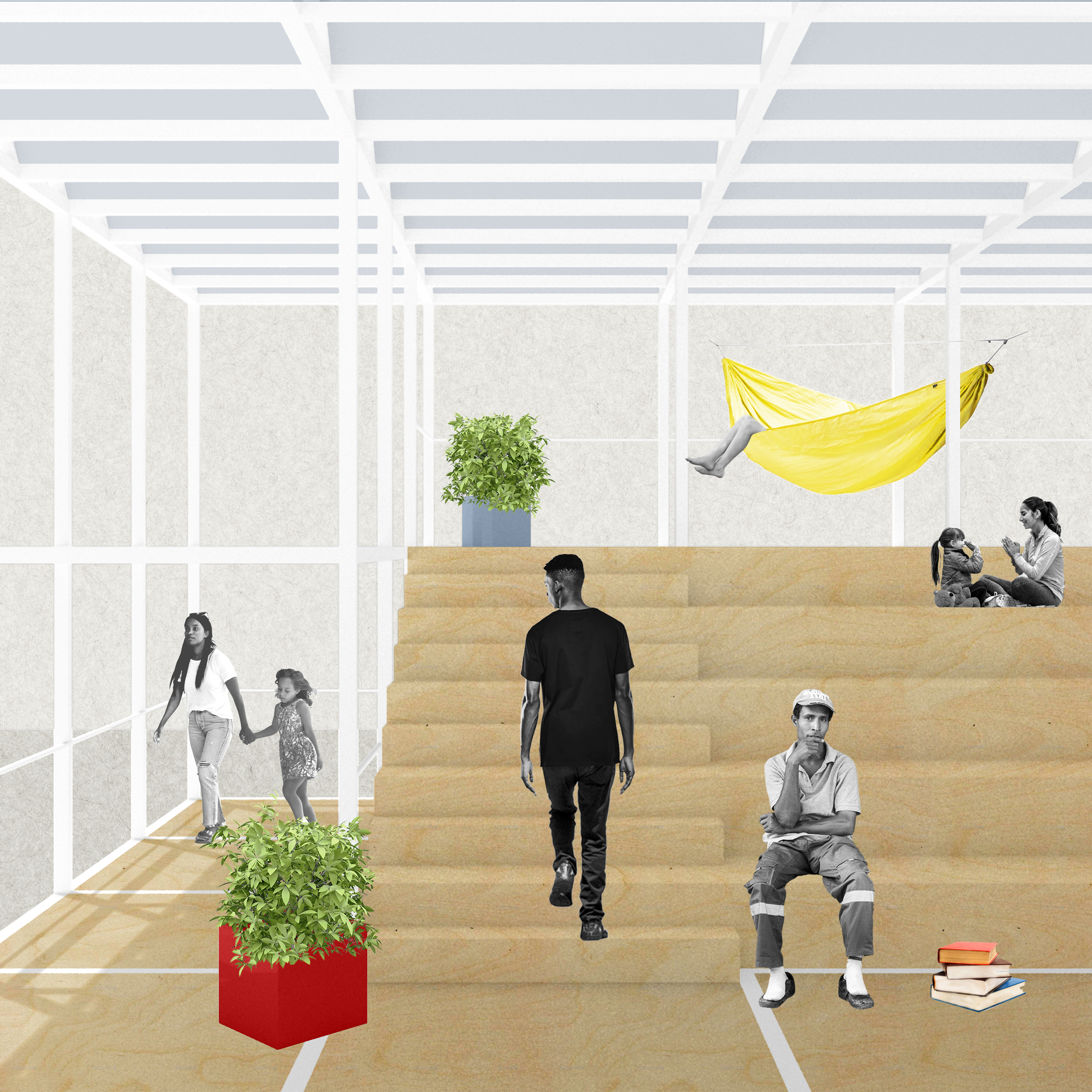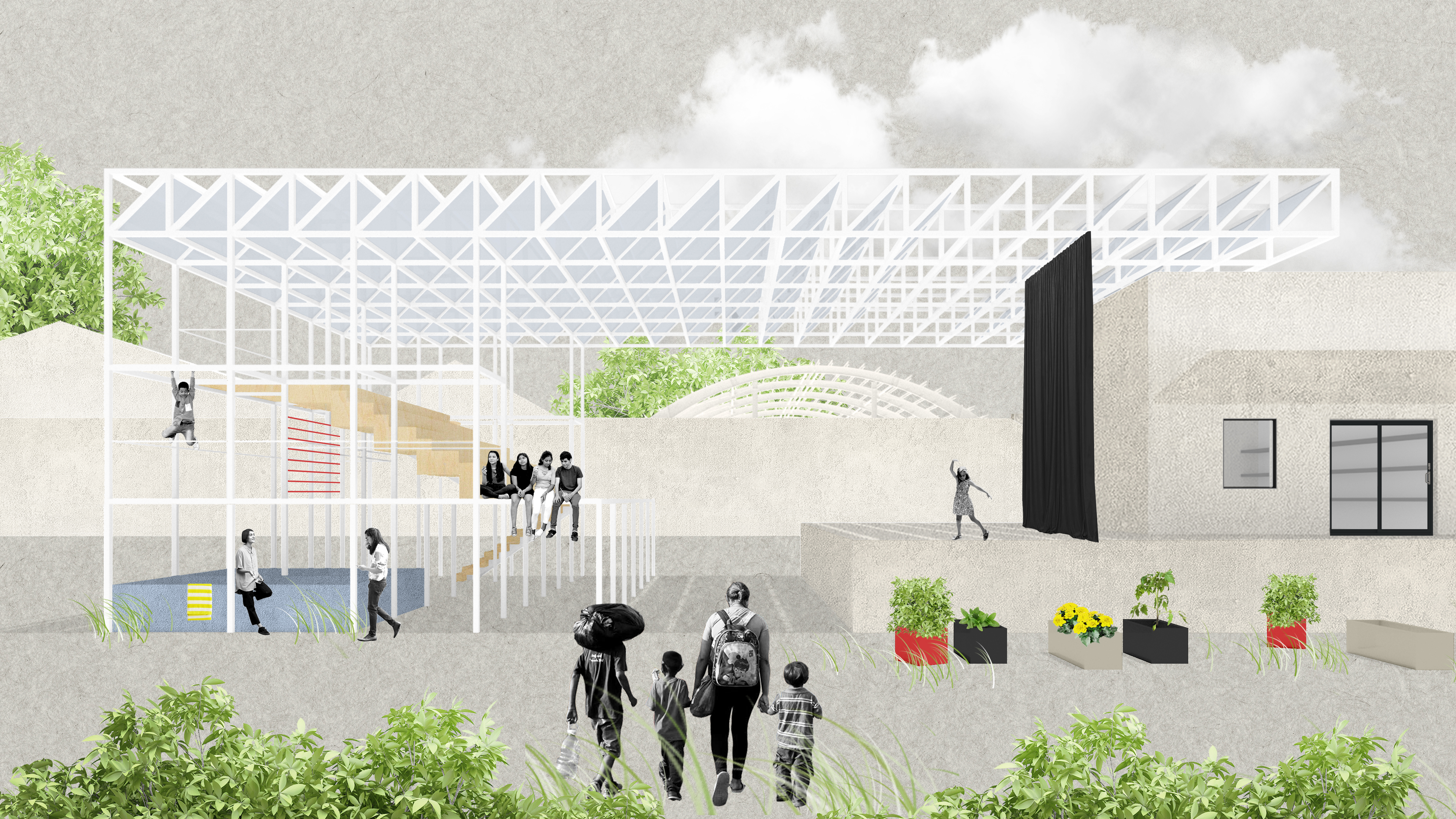 The answer begins to be addressed here but not through what its architecture can do but, rather, through what the project proposes. The self-preservation and positive self-perception of the migrant and local community rests in rejecting the homogenization of their individuality, in making possible for them to reassert their personal responsibilities, of acting collectively with a communal interest in mind, and of expressing their identities and needs through the de/re-programing of spaces they can gather in, occupy, and use.